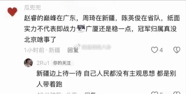 另一位新疆的网友评论道:“赵睿的巅峰在广东,周琦在新疆,陈英俊在省队,纸面实力不代表即战力,广厦还是稳一点,冠军归属真没北京啥事了。”赵睿回复:“新疆边上待一待,自己人民都没有主观思想,都是别人带着跑。”